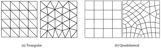 A two-dimensional computer software is developed, incorporating the adaptive finite element procedures explained above, to simulate the elastic and plastic plate problems. The square plate domain is discretized as regular and irregular meshes using triangular/quadrilateral elements. The triangular/quadrilateral element meshes for plate domain are shown in Figure 3. The error convergence with different orders of mesh in the finite element analysis and effectivity of error estimation using a standard/modified patch-based ZZ stress recovery and a modified patch-based displacement recovery, for triangular elements, are listed in Table 1, Table 2, Table 3 and Table 4. The analysis results for error convergence and effectivity using quadrilateral elements are shown in Table 5 and Table 6. The solution errors were measured in the energy norm. The convergence rate of error with regular subdivision for the linear/quadratic triangular elements and the linear quadrilateral element in the original solution, the recovered solution using a standard patch-based ZZ recovery, a modified patch-based ZZ recovery, and a modified patch-based displacement recovery are obtained, respectively, as (0.97875, 1.37313, 1.87252, and 1.88603), (1.97848, 2.50622, 3.19768, and 2.88449), and (1.00169, 1.65603, 2.35230, and 2.02723). The error convergence rates are obtained in finite element results as (0.58530, 0.848150, 0.95638, and 1.11017), (1.07415, 1.26349, 1.57042, and 1.61414), and (0.54163, 0.98011, 0.94495, and 0.98600), respectively, for linear/quadratic triangular elements and linear quadrilateral element considering irregular subdivisions.
