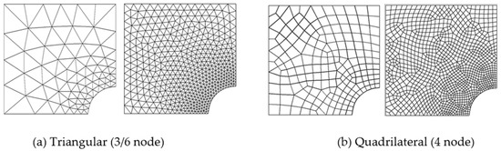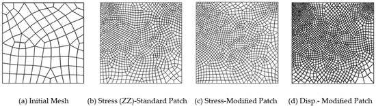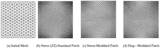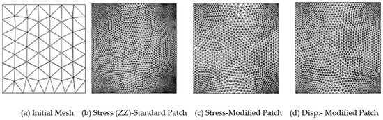 The improved ZZ recovery technique-based error estimation for guiding the error controlling strategies of adaptive analysis is also demonstrated. Adaptively improved meshes of the elastic problem analyses are obtained for the ZZ super-convergent patch recovery, ZZ recovery technique, and displacement recovery technique using a modified patch configuration at a target error of 4%. Table 10 shows the global errors, the number of elements, and the DOF in refined meshes, obtained from the triangular and quadrilateral element meshes, to bring the solution accuracy to the target error level. The number of elements required to achieve the target error depends on the global error and distribution of error. The adaptively refined meshes with target error using different recovery-based error estimations are given in Figure 7, Figure 8 and Figure 9. The initial meshes are adaptively refined to bring the solution error within the target error limit. It is clear from the figures that the improved ZZ recovery technique-based finite element analysis is very effective for converging a predefined accuracy in a solution with a significantly smaller number of degrees of freedom for elastic plates.