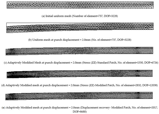 The performance of the improved ZZ recovery technique is also assessed under large or plastic deformation using a sheet stretching process analysis. The adaptive analysis results considering the various stress/displacement recovery techniques are shown in Figure 6. From the adaptively modified meshes, it can be observed that the elements become finer in some parts of the sheet and coarsening in other parts. The meshes become finer in stress concentration zones of the problems. It is also clear from the large deformation problem analysis that the improved ZZ recovery technique-based finite element analysis recovers the errors more reliably, and a larger fine element zone across the full sheet thickness at the sheet-punch contact and at the sheet-die contact is created.