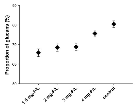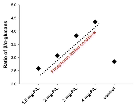| P-Concentration (mg-P/L) | Total Glucans (α + β) (%DW) | 1.3:1.6-β-Glucans (%DW) | 1.3:1.4-β-Glucans (%DW) | α-Glucans (%DW) |