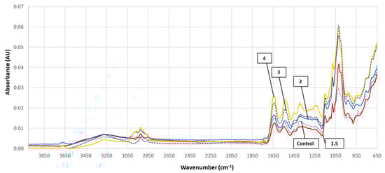 | 1590–1715 (1650) | CO stretch, CN stretch, NH bend/amide I band (proteins), C=C stretch/olefinic and aromatic compounds | [45,47] |