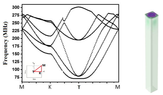 With the above method, in this paper, the eigen modes of Al/SiO2/36° LiTaO3 phononic crystals were analyzed. Figure 4 illustrates the band structure and typical mode of the PnCs. Multiple curves consisted of discrete points for eigen frequencies at each wave vector. The X-axis is the wave vector scanning the area of the first Brillouin region, which can be on behalf of the whole band structure according to the Bloch Periodic Theorem. The Y-axis is the eigen frequencies for each wave vector. The results show that in the low-frequency stage below 200 MHz, there is nearly no band gap. This means that most of the wave can be transmitted in this region with little attenuation.
