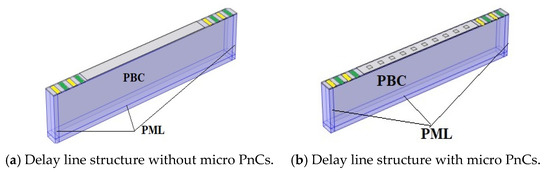 The quasi-three-dimensional models of delay line structures with and without micro PnCs.