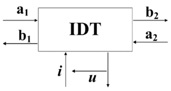 where is the input of the acoustical ports, is the output of the acoustical ports, u is the voltage of the electrical port, i is the electrical current of the electrical port and is the P matrix element of the IDTs.