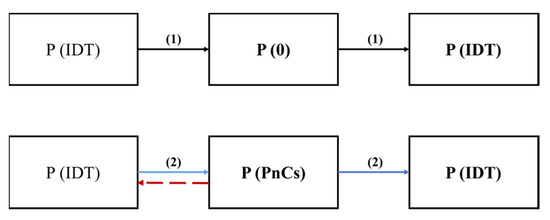 Furthermore, to analyze the transmission of the piezoelectric PnCs, a P matrix as shown in Figure 7 was introduced. According to the theory of the P matrix [29], IDT can be described as a three-port network (Figure 4) with two acoustical ports and one electrical port, as shown in the following equation: