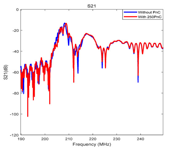 The electrical responses were measured by the vector network analyzer (VNA) with the Keysight E5071C. As the direct measurement data had many reflective signals of the bottom, the time domain window was added to extract the useful information. The treated results are demonstrated in Figure 11. From the Figure 11, it can be seen that the main peak has been slant after introducing the micro PnCs, along with a little shift up of the frequency, but with little attenuation.