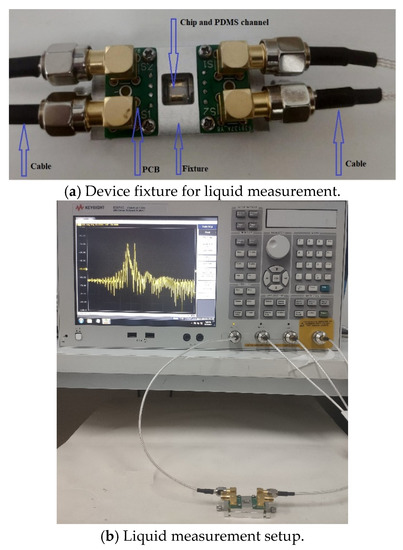 To further explore the actual performance of the new Love wave mode delay line structure with micro piezoelectric PnCs, experiments with liquid environment were conducted. As shown in Figure 12, the micro liquid channel was designed for the device using polydimethylsiloxane (PDMS), which has good biocompatibility. Using the technology of the boning, the micro-PDMS channel was combined with the Love wave mode sensor chip.