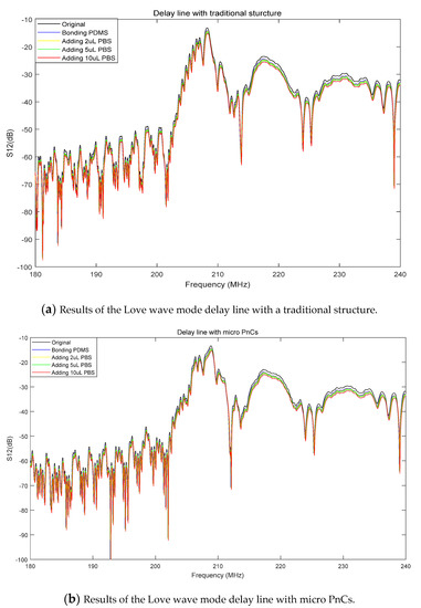 For the liquid environmental experiment, phosphate buffer saline (PBS) was used as the liquid sample. Devices with the traditional Love wave mode delay line structure and the new Love wave mode delay line structure were added, respectively, with 2 µL, 5 µL and 10 µL PBS solution. The electrical responses were also measured using the vector network analyzer. The treated results of the Love wave mode delay lines with respective original status, adding PDMS channel, and adding PBS solution, are demonstrated in Figure 13.
