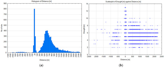 (a) Spatial distribution of ship’s position relative to track axis at leg N4, incoming traffic; (b) scatterplot of ships draught versus distance from centre.