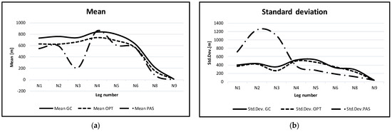 For the subsequent section of the route, the spatial distribution of ship position relative to the centreline of the traffic route was determined. Figure 5a shows the mean and Figure 5b the standard deviation of vessel position from cross-section N1 to N9. For the gates numbered N4 to N6, the traffic flow outside the marked and dredged channel was considered. The graphs show that the oil product tankers navigated closer to the centreline of the fairway than general cargo vessels. The mean and standard deviation had lower values. Like the vessels on the regular line (which allowed for following the same defined route), the passenger vessels travelled the closest to the centreline of the defined route. The traffic flow parameters for all groups of vessels decreased relatively by the same value when approaching the port entrance (leg N9). The difference in the traffic flow parameters of passenger vessels resulted from the character of the traffic. The vessels mostly joined the traffic at gates N3 and N4 and steer as close as possible to the marked channel.