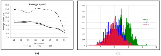 Vessel speeds are constantly changing in the approaching fairway. The average speed for each type of vessel at each crossing gate was calculated. As can be seen in Figure 6a, the average speed varied between 8 kn and 14 kn. The speeds of OPT and GC vessels are comparable, but significantly higher speed values can be seen for the PAS vessel. The different speed selection for different vessel classes resulted from the manoeuvring characteristics of the vessels. Passenger ships (ferries) had excellent manoeuvrability. Compared to GC or OPT ships, it took less time to reduce speed. The second factor is that the navigators on PAS ships were familiar with local waters and special conditions and could guide the ships through busy areas. The masters were Pilotage Exemption Certificate owners, so there was no reason to reduce the speed for pilot embarkation.
