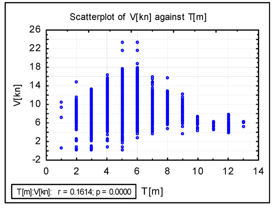 Figure 6b shows the histogram of ship speed for three groups of ships on the N5 leg. The speed varied from 5 kn to 18 kn. Only a few ships navigated at a speed of less than 5 kn or more than 18 kn. Most vessels do not navigate at full speed, and vessels can be expected to change speed during the passage depending on the situation. Vessels with draughts T greater than 10 m navigate at a reduced speed in the range of 4 kn–8 kn, as shown in Figure 7.