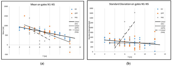 Figure 8a shows the relationship between the mean distance of ships from the centre and the draught T of the ship. Simple linear regression models were constructed for three groups of ships. It can be seen that there was a linear relationship between these parameters, with a coefficient of determination of 0.8 for GC, 0.7 for OPT, and 0.27 for PAS. For the GC and OPT vessels, the regression coefficient was satisfactory according to the accepted interpretation. It can be concluded that the higher the value of the draught, the closer to the middle of the track the navigator is sailing. The correlation between standard deviation and draught of the vessel was lower than for the mean value. The best coefficient of determination was for PAS (R2 = 0.60), as shown in Table 1. Although the coefficient of determination for the GC group was low, the independent parameter T was statistically significant for the model (p = 0.004). For OPT vessels, the parameter T was not statistically significant (p > 0.05). An interesting result is a correlation between standard deviation and draught for passenger vessels. As the draft increased, the standard deviation increased accordingly. These results confirmed the specificity of passenger ferry traffic in the selected area, and further analysis is required. The model is valid for PAS ships with T ≥ 4 m.