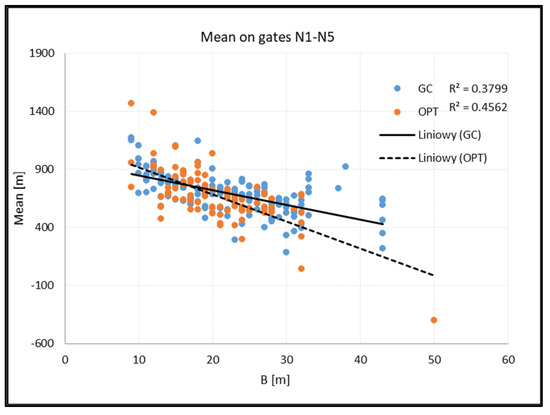 Testing the correlation between mean, standard deviation, and width of the ships showed that a regression model could only be constructed for the mean width relation for GC and OPT ships (for gates N1N6). The wider the ship, the closer to the middle of the track the navigator sails, as shown in Figure 9. R2 for the GC was 0.37, which means that the model explained 37% of the variability of the response data around its mean, as shown in Table 2. For OPT vessels, the model explained 45%. Although the coefficient of determination was not high, the statistic p was equal to 0.00. For both models, the significant p-value indicates that we can reject the null hypothesis that the coefficient is equal to zero (which still indicates a fundamental relationship between the significant predictors and the response variable). The coefficient of determination may be low because the model predicts the behaviour of the navigator. People are more complex, thus less predictable than, for example, physical processes.