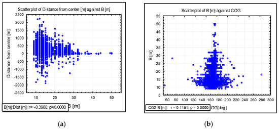 The wider the ship, the closer to the centre of the track she navigates, as shown in Figure 13a. The parameter B of the ships particulars had a similar effect to T. The wider the ship, the more accurately she sails. The deviation from COG was much less, as shown in Figure 13b. The coefficient of determination was low, but the p-value was 0.000, indicating that parameter B was statistically significant.