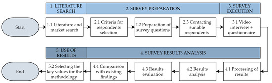 Based on the decision to develop a questionnaire and syllabus for the interview, a process map of the research (Figure 1) consisting of five main steps was prepared: literature search, survey preparation, survey execution, analysis of results and use of results. These steps contained subprocesses that are described in the next sections.