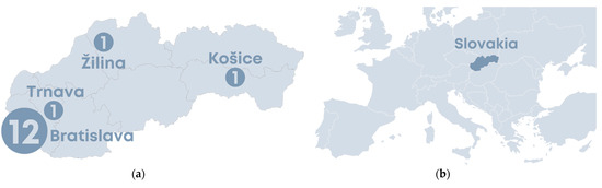 (a) Map of Slovakia with the number of respondents and name of the cities where the headquarters of the companies are located. (b) Map of Europe highlighting Slovakia.