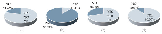 For the questions in Figure 3b–d, the respondents said that they did not use BIM for risk and hazard detection during the design stage (Figure 3b—88.89%), but only during construction preparation (Figure 3c—70.00%) and construction (Figure 3d—90.00%).