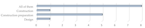 However, the answers to the question in Figure 4 were the opposite, in which up to 53.33% of all respondents said that hazard detection should be performed in all phases: design, pre-construction and construction. Another 33.33% answered that it should start in the pre-construction stage.