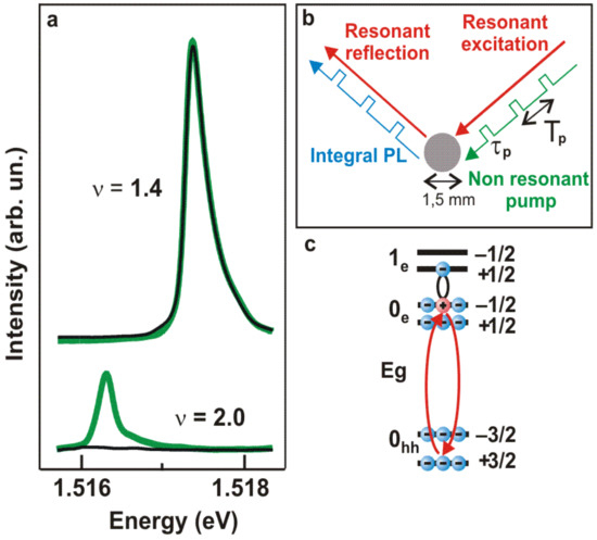 All optical measurements were taken in the temperature range from 0.45 to 1.5 K in the presence of a magnetic field of up to 6 T, using a double-fiber technique (Figure 1b). One fiber carried the laser diode radiation for non-resonant pumping of magnetoexitons simultaneously with the resonant pumping from a tunable narrow-band laser. The other fiber was used to collect the resonant reflection signal from the pumping spot and register the photoluminescence response. Then, the same fiber guided both signals to the entrance slit of a grating spectrometer equipped with a cooled CCD camera or the silicon avalanche photodiode in photon-counting mode connected to a time-gated photon counter to study the kinetics of resonant reflection. In these experiments, the pump/probe spot size diameter was approximately 1.5 mm. A broadband laser diode with an excitation wavelength of 780 nm and a spectral width of 10 nm was used as an optical source to produce spin excitations and a photoluminescence signal. For the resonant reflection source, we used a semiconductor tunable narrow-band “TOptica” laser with a spectral bandwidth of 1 MHz.