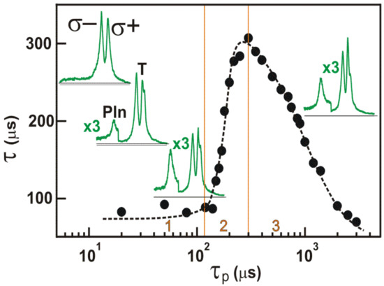 Dependence of the PRR signal decay time τ on the pumping pulse duration τp, measured at the pump power of 50 μW for sample 2 (black dots). The insets (left to right) show the shape of the photoluminescence spectra measured for different values of pump pulse duration, τp = 10 μs, 30 μs, 100 μs, and 1000 μs.
