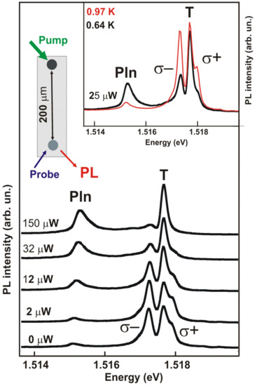 Optical transitions associated with the three-particle complexes signal the appearance of spin-triplet magnetoexitons in the probing region. Therefore, by observing the variation in luminescence spectra, it is possible to detect the arrival of the spin-triplet magnetoexcitons that were formed far away from the probing point and yet were able to overcome such a separation distance. The inset in Figure 3 shows another experimental scheme. This time, a single excitation laser beam is split into the pumping and probing components. Long-lived spin-triplet magnetoexcitons are formed in the photoexcitation spot ~20 µm in diameter, where their concentration can be manipulated by varying the pump power. Magnetoexcitons arriving at a probing spot separated from the pumping spot by ~200 μm are registered based on the changes observed in the luminescence spectra. Figure 3 shows the luminescence spectra measured in the probing area for different pumping power levels at the excitation area. Data plots display the lines related to single-particle transitions designated by σ− and σ+, as well as the plasmaron (Pln) and trion (T) lines due to the presence of magnetoexcitons in the probing region. We observe that increasing the pumping power at the excitation area leads to a higher intensity of the Pln and T lines, indicating that dark magnetoexcitons from the photoexcitation spot enter the probing area, having overcome the ~200 μm separation distance.