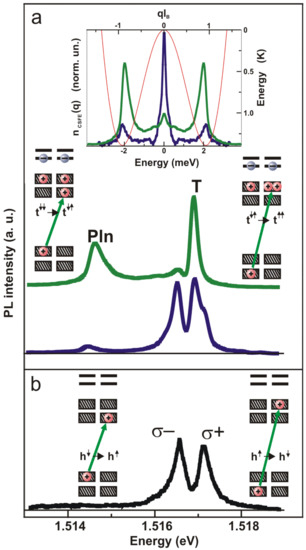 It has been shown in previous studies [15] that, at low concentrations of magnetoexcitons, the photoluminescence spectrum contains two single-particle lines indicating σ- and σ+ polarizations of light (top left inset in Figure 2). These lines correspond to the radiative recombination of electrons with spin projections of +1/2 and −1/2 and heavy holes with spin projections of −3/2 and +3/2, respectively. As the density of dark magnetoexcitons increases, the luminescence spectrum undergoes significant changes. There appear two additional lines related to recombination originating from three-particle complexes constructed from a dark magnetoexciton and an extra Fermi hole. When spin projections on the axis of the magnetic field of a Fermi hole within the magnetoplasmon and an additional Fermi hole coincide, a spin-triplet is formed. Otherwise, if the spin projections of the two holes are oppositely directed, it leads to the formation of a spin-singlet.