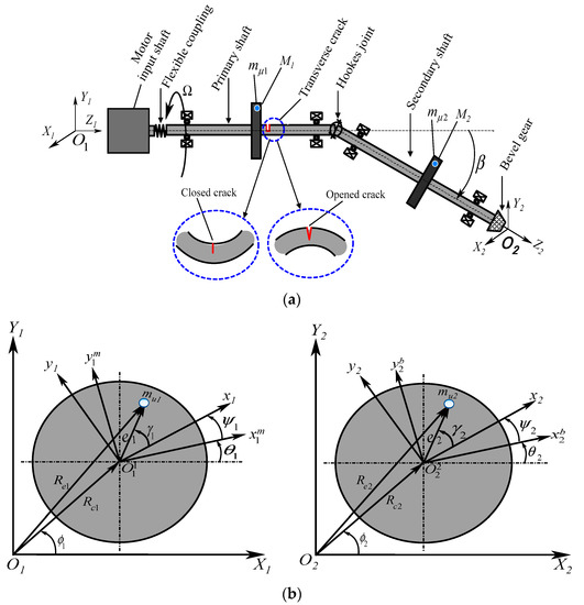 The Hooke’s joint (universal, Cardan, or U-joint) is a widely studied mechanical connection commonly used in various types of industrial drivelines [2,3,4,5,6]. The maintenance of such a system, unfortunately, is often arduous due to its inaccessibility, function, and size, making its mechanism one of the most commonly misunderstood issues a vehicle operator may experience. Cardan joint has a wide range of applications in the automobile industry for transmitting rotary motion. However, when it comes to mechanical failures, faults such as unbalance and crack may contribute to premature wear of the joints if not early detected. Unfortunately, in modern machinery, due to high rotation and periodical fluctuation speed, the shafts system connected by a Hooke’s joints is often challenging, making their analysis one of the most complex and most overlooked. The industry is continuously seeking scientific innovations and techniques to improve the lifespan of rotating machinery and equipment, as well as a new technology for monitoring and maintaining rotor systems. These systems composed of rigid or flexible misaligned shafts connected by joints, transmit the rotational motion to the driven shafts. In most published studies, the Cardan shaft systems are considered with a maximum of two degrees of freedom (DOF) lumped-mass models consisting of torsionally elastic, massless shafts. However, for reliable dynamic system analysis and prediction of the instability characteristics of these shaft systems, studies of a complex system cannot be expected to be successful using such approximate low-dimensional models.