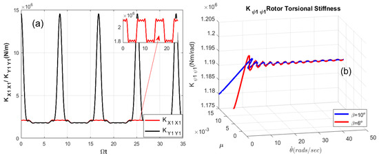 Following the approaches of the previous section and based on Equation (21), the transient stiffness matrix of the rotor system obtained by differentiating the potential energy can be expressed as: