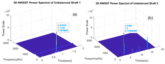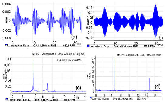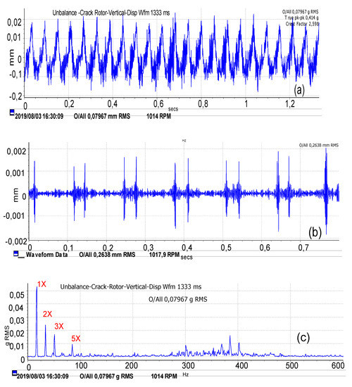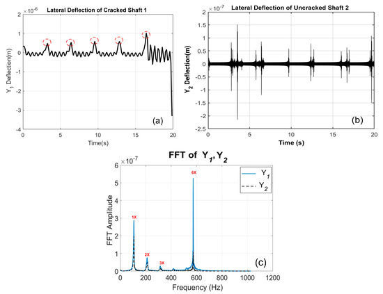 In this section, a theoretical analysis of an unbalanced reaction is described, as well as an experimental dynamic analysis performed at a maximum driveshaft rotational speed of 1500 rpm in a start period of 5 s. The dynamic response of the rotor system under crack effects was numerically determined by the fourth-order Runge–Kutta algorithm with an integration time step of 0.001 s. To make sure that the condition of the experiment would match simulation parameters, the torsional deflection angle was very small compared to the rotor’s lateral-torsional deflection; i.e., no torsional flexibilities accounted for (). The resulting rotor velocity profile at a maximum rotational speed of 1500 rpm in a start period of 5 s is shown in Figure A2 (Appendix A). The vibration signal of the unbalanced driveshaft due to the constant angular speed was analysed and compared with that at the angular speed fluctuation of the driven shaft. The fast Fourier transform (FFT) spectrum and the lateral displacement of the system were used to extract the feature of the connected Cardan shaft (Figure 5).