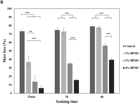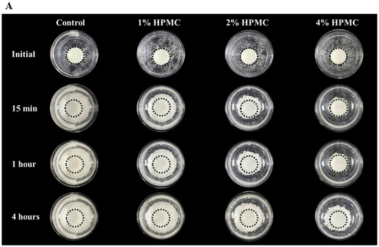The qualitative and quantitative evaluation of premixed putty before and after being soaked in simulated body fluid (SBF) for 15 min, 1 h, and 4 h are shown in Figure 2A,B. None of the initial premixed putty groups disintegrated until immersion in SBF. The control group without HPMC disintegrated faster than those with HPMC after immersion in SBF for 15 min (p < 0.001). The premixed putty group with 1 wt% HPMC was almost 70% particles after 1 h. It disintegrated significantly faster than the premixed putty with 2 wt% and 4 wt% (p < 0.001). Further, the premixed putty group with 2 wt% HPMC was a better anti-washout than that with 1 wt% HPMC (p < 0.001). The premixed putty group with 4 wt% HPMC disintegrated less than 40% after 4 h and decayed significantly less than the other groups (p < 0.001). We conclude that the less HPMC in the premixed putty, the more quickly it decayed during prolonged soaking.