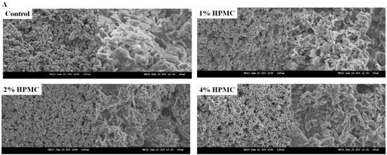 SEM micrographs (300× and 1000×) of premixed putty containing HPMC with different mass ratios after being soaked for 4 h. (A) Micrographs of the main body. (B) Micrographs of particles.