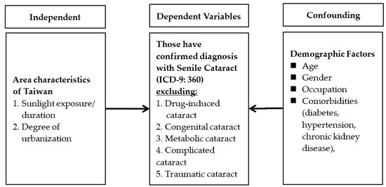 This research focused on senile cataract (ICD-9 code: 3661, including ICD-9 codes 36610–36619) but excluded drug-induced cataract, congenital cataract, metabolic cataract, complicated cataract, and traumatic cataract. Therefore, the case group would be age 40 and above and diagnosed as senile cataract but would exclude some specific diagnoses mentioned above; the control group would be age 40 and above without a diagnosis of senile cataract.