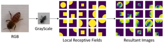Figure 1 illustrates how we constructed LRFs for this investigation. All RGB images are grayscaled and resized to . We defined 20 different LRFs, each of which covers a specific area of the input image (See Local Receptive Fields in Figure 1). We refer to the process of superimposing an LRF on an image as LRF overlap. Although, in principle, LRFs may have arbitrary shapes, we confined our investigation to circles and squares of specific radii and side lengths. Given a radius of 32 and a side length of 32, a circle’s center and a square’s top left corner are shifted left to right across a image in increments of 16 pixels and their intersections with the image are taken to represent 9 LRFs defined by the intersections of the image with the shifting circle of radius 32 and another 9 LRFs defined by the intersections of the image with the shifting square with side 32. LRF 19 is the intersection between the image and the circle of radius 16 placed in the center of the image. LRF 20 is the intersection between the image and the square with side 16 placed in the center of the image. Each LRF, when overlapped with an image, may contain a whole bee, part of a bee, or no bee (See Resultant Images in Figure 1).