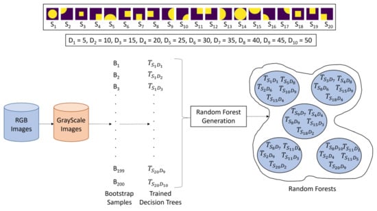Let us assume that an RRF F contains n DTs each of which has been trained to classify images into C classes with a specific LRF. Given an input image (i.e., of height h and width w), for each DT in F, the image is overlapped with the DT’s LRF. To perform the overlap, each pixel in the image is checked to see if it is present in the LRF’s pixels, which requires operations. LRF overlapping is analogous to masking, because all pixels covered by the LRF retain their original values, whereas all other pixels are set to 0. If F contains n DTs, the number of overlap operations is .