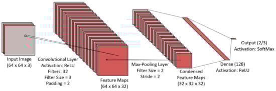 The SCN architecture we used in this study is shown in Figure 3. In addition to the input and output layers, the architecture consists of a convolutional layer (CL), max-pooling layer (MPL), and a fully connected layer (FCL). We fixed the node activation function to ReLU and incremented the number of filters in the CL and MPL and the number of nodes in the FCL until the persisted trained SCNs (i.e., instances of the SCN architecture) satisfied the shallowness criterion to have the memory footprint of ≤50 MB.