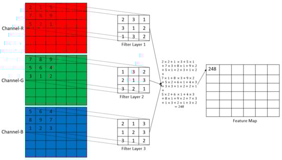 Let the input dimensions to the CL be and suppose that the CL has filters, each of which has dimensions . The formula for the total number of parameters in the CL, , is given in Equation (3) as the sum of the numbers of the shared weights in the filters and the number of biases, the latter being equal to the number of the filters.