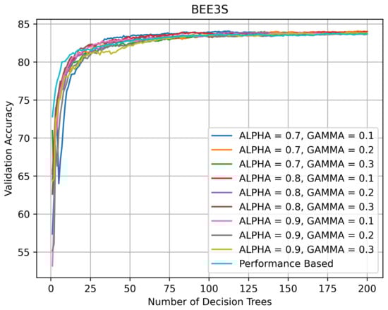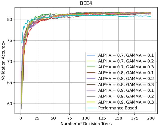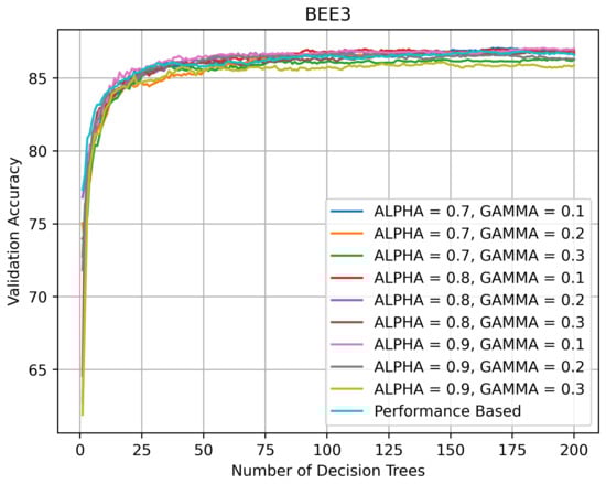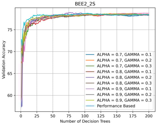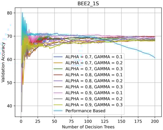 It is instructive to inspect the validation accuracy curves of the HQL RRFs and PRFs on various datasets with the values of and parameters (See Equation (1)) used in the grid search. Figure 7 indicates that on BEE1 all RFs kept improving performance until the number of the DTs in them reached 30, after which their validation accuracy varied between 90% and 95%. The PRF’s accuracy reached its peak performance of 91% when the number of DTs in it was 20, after which it started slowly declining until its number DTs exceeded 75, after which the rate of decline accelerated.