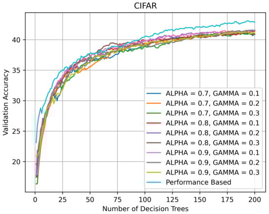 We call the fourth classifier the performance RF (PRF). To generate the PRF, the trained DTs are sorted in the descending order of their validation accuracies. Let this sequence be , where is a DT and is the maximum validation accuracy and is the minimal accuracy. The sequence is used in construction of the PRF in the same way as the sequence is used in the construction of the HQL RRF. Put another way, the PRF is constructed from the minimal subsequence of DTs added in the order of the DTs in that has the maximum validation performance. The PRFs were trained on the grayscaled images of all datasets.