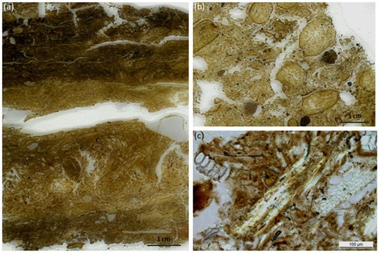 Modern dung cakes from Central Anatolia in Turkey (ethnographic and sample descriptions can be found in [6,29]). (a) Scan of a resin-impregnated thin-section illustrating the trampled structure of compacted cattle faeces from an enclosure containing organic material and other mineral inclusions; (b) scan of a thin-section from a dung cake manufactured in winter composed of sheep dung pellets, organic matter, and mineral inclusions; (c) detail of the same sheep dung cake displaying anatomically connected or multicelled phytoliths from leaf epidermal tissues (200×).