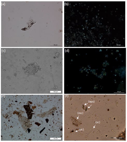 Due to the large number of components frequently contained in archaeological faecal matter, from plant remains to parasites, multiproxy approaches are the most suitable for extracting all the information contained within them to help in our understanding of past diets and ecological strategies. However, as this review has shown, there is currently no general agreement on how to approach faecal residues methodologically, and archaeologists have to choose from a wide range of analytical techniques based on research questions, a methodological variability that often makes comparative studies between sites and regions difficult. Micro-contextual methods such as thin-section micromorphology are particularly useful for examining the depositional context of dung and have proven crucial for understanding continuity and change in the use of space within settlements over time and animal management strategies, as well as the impact of burial conditions on the preservation of faecal materials [43,44,45]. Phytoliths are particularly abundant in archaeological faecal matter from the study areas, especially in herbivore dung, and are substantially resistant to heating and to a variety of soil pH and burial environments. Phytolith analysis has revealed important dietary and seasonal patterns in the study areas, often geographically specific [15,17,18,43], although their presence in faecal matter varies significantly depending on which plants were consumed and which plant parts were ingested, since phytolith production differs notably between species and plant parts.