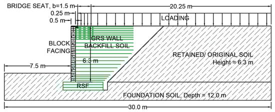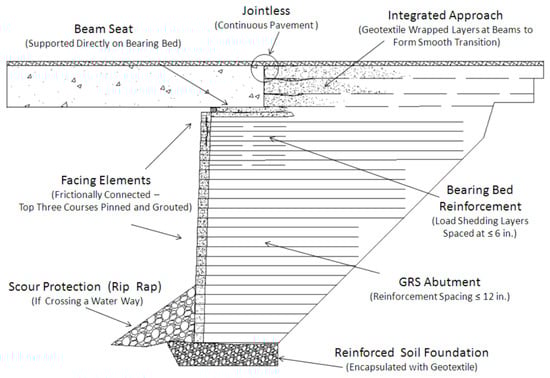 In the United States, the application of geosynthetic-reinforced soil (GRS), a retaining wall (RW) as a bridge abutment was initially developed by the Federal Highway Administration (FHWA), called the GRS—integrated bridge system (GRS-IBS). There are several variations of this technology. Typically, the GRS-IBS includes a GRS abutment, reinforced soil foundation (RSF), bearing bed reinforcement, bridge seat, and an integrated approach (see Figure 1). The RSF is composed of granular fill material that is compacted and encapsulated with a geotextile. It increases the bearing capacity and width of the GRS abutment. The GRS abutment uses alternating backfill layers that are well-compacted and short-spaced geosynthetic reinforcement to provide support for the bridge. The bridge is placed directly on the bridge seat of the GRS abutment without joints or the use of bearing. Under the bridge seat is the bearing bed reinforcement zone, which provides support for the bridge loads. This technology also has an integrated approach that provides a smooth transition without joints between the superstructure and alleviates the problem on the differential settlement between bridge abutments and approach roadways [,].