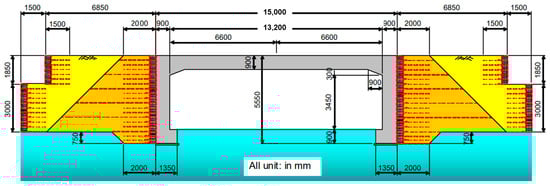In this study, the GRS-IB model is a modified design based on the full-scale model in Japan [,] and the created model of GRS-IBS in this study. The IB design of the former and the GRS RW abutment configuration of the latter are combined to complete the GRS-IB model design for this study. The final design and detailed specifications of the GRS-IB model is depicted in Figure 3a. The GRS-IB also has a clear span length of 15.0 m and a clear height of 5.3 m, similar to the GRS-IBS. The GRS-IB includes a GRS abutment, RSF, FHR facing, and RC footing. The FHR facing is the substructure that is continuously connected to the superstructure, which is the RC bridge girder, eliminating the joints and bearing, thus forming an integral bridge structure. The FHR facing has a width of 0.9 m and its footing has width of 1.35 m and thickness of 0.9 m. The RSF underneath the base of the GRS-IB has dimensions and reinforcements similar to those of the GRS-IBS. The RSF extends by 1.0 m from the toe of the FHR footing. Moreover, in order to have a similar condition with the GRS-IBS model, the abutment has a cut slope of 1:1 and the same reinforcement quantity, spacing, and lengths are used for the GRS-IB model, except for the intermediate reinforcements at the bearing bed zone. The GRS-IB model does not include a bridge seat, thus the bearing reinforcement zone is not needed. The bridge loads are supported directly by the FHR facing. The FHR facing is connected to the GRS RW abutment. The abutment uses gravel bags that are placed at the facing, compacted to a thickness of 0.1 m and width of 0.4 m. The lowest and uppermost reinforcement layer zones include two wrapped layers of gravel bags, while the middle reinforcement layer zone includes four wrapped layers of gravel bags. The steel reinforcements are added to connect the GRS RW and FHR facing. The steel reinforcement has a vertical spacing of 0.4 m and horizontal spacing of 0.15 m.