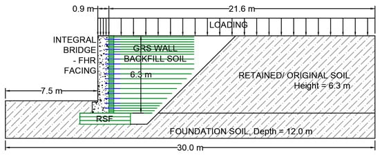 Considering the right-hand side of the bridge and abutment, the 0.90-m thick integrated approach backfill and the 0.90-m thick RC bridge girder are removed and converted into its equivalent vertical loads. Thus, the height of the abutment is left at 6.3 m from the base. The models are designed with enough horizontal and vertical distance from the right-end and bottom boundaries, respectively. The horizontal distance from the right-end to the wall facing is more than three times the height of the wall. The vertical distance from the base of wall to the bottom boundary is almost twice the height of the wall. The front-end is 7.5 m from the wall facing because this is the half-point of the bridge (with a clear width of 15 m). Consequently, the boundary conditions are modelled wherein the vertical sides of the models at X = 0 and X = 30 are fixed on the X-direction, while the bottom boundary at Y = −12 is fixed on both the X and Y-directions. In other words, a fixed boundary condition is applied at the bottom of the model while a roller boundary condition is applied on both sides of the model. The FE models of the bridges are simulated in Plaxis 2D based on the example procedures in the Plaxis 2D Reference and Tutorial Manuals [,] as well as on a few related literature studies including Abu-Farsakh et al. [,], Ardah et al. [,], Koda et al. [], Tatsuoka et al. [], and Yazaki et al. [].
