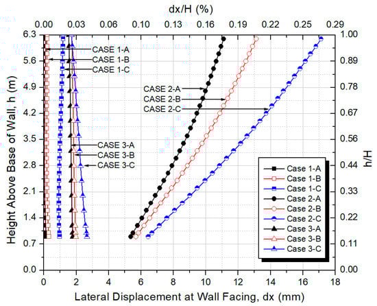 Next, we discuss the GRS-IB versus GRS-IBS models. It is comparable that the GRS-IB (Case 1A–C) and GRS-IBS (Case 2A–C) models exhibited almost similar dy behavior at the top of the wall abutment because these models have geosynthetic reinforcements, although with few reasonable distinctions. The results show that the maximum dy in the GRS-IB models are located within 1.8 m to 2.4 m from the wall facing, while the maximum dy in the GRS-IBS models are located at 1.8 m from the wall facing. Both the GRS-IB and GRS-IBS models showed the maximum dy within the first quarter (0.25 L) to about one-third (0.34 L) of the reinforcement length (L). Hence, one of the few distinctions in the dy behavior of the GRS-IB and GRS-IBS models can be observed from 0.5 m to 2.5 m from the wall facing. This is because for the GRS-IBS model, the bridge loadings are applied directly on top of the bridge seat zone (0.75 m to 2.25 m from the wall facing), which are 2.2–5.6 times greater than the roadway loadings. Another distinction in the dy behavior can be observed at the wall facing. The GRS-IB models exhibited larger dy at the wall facing because the bridge loadings were supported by the 0.90 m-thick FHR facing, whereas the GRS-IBS models had 0.50 m-width block facing that did not carry any external vertical loads. Lastly, it can be observed that after 3.0 m from the wall facing, the GRS-IBS models showed lesser dy than those of the GRS-IB models. In this case, the dy behavior was influenced by the backfill soil deformation during the construction. The GRS-IB models have greater backfill zone deformation than those of the GRS-IBS models because the GRS-IB models have weaker wall facing, thus exhibiting greater wall facing deformation.