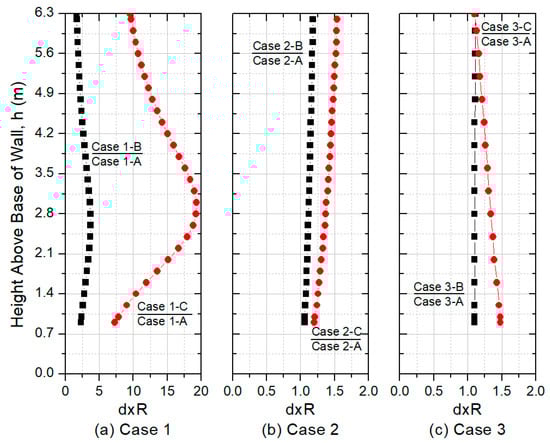 The results plotted in Figure 8a show that Case 1B had a maximum increase of 3.7 times when the additional load of 30 kPa (traffic load) was applied on the bridge after the bridge construction and that Case 1C had a maximum increase of 19 times when the additional load of 50 kPa (railway load) was applied on the bridge after the bridge construction. Here, the effects of the applied loading for Case 1A–C are great at 2.80 m above the base of the wall. The magnitude of dxR for Case 1B–C may seem great because it is relative to the dx at the end of the bridge construction (Case 1A) which is almost zero (0.002% dx/H max) (refer to Figure 7). Conversely, the magnitudes of dxR are about similar for Case 2A–C, which are between 1.06 and 1.54 (Figure 8b), and Case 3A–C, which are between 1.10 and 1.48 (Figure 8c). However, the dxR trends are opposite. The effects of the applied loads for Case 2A–C are great at the top of the wall facing, while the effects of the applied loads for Case 3A–C are great at the base of the wall. The trends of dxR shown by the models are very similar to the dx behavior shown in Figure 7. Here, the magnitude of dxR are quite small because it is relative to the dx at the end of the bridge construction; consider Case 2A (0.18% dx/H max) and Case 3A (0.03% dx/H max), which are a lot higher than Case 1A (0.002% dx/H max).