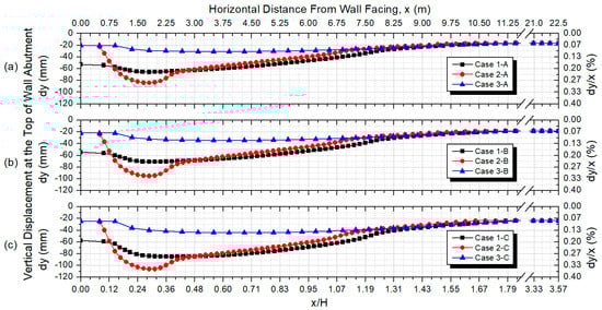 Vertical displacements at the top of the wall abutment, dy (mm): (a) Case 1A, 2A 3A (end of bridge construction); (b) Case 1B, 2B, 3B (general traffic loading); and (c) Case 1C, 2C, 3C (railway loading).