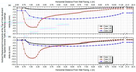 Vertical displacement increments at the top of the wall abutment, ∆dy (mm), after the applied static loadings: (a) Case 1B, 2B 3B (general traffic loading) and (b) Case 1C, 2C, 3C (railway loading).
