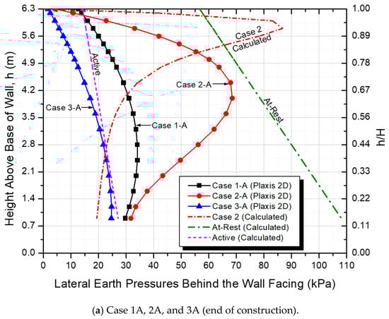 In general, based on the results shown in Figure 11, the lateral earth pressures behind the wall facing increase as the general traffic and railway loads are applied after the bridge construction. After the bridge construction, the lateral earth pressures increase by 1–34% (Case 1B), 1–162% (Case 2B), and 5–255% (Case 3B) when the general traffic loadings were applied. Similarly, the lateral earth pressures increase by 9–157% (Case 1C), 1–407% (Case 2C), and 12–515% (Case 3C) when the railway loadings were applied after the bridge construction. The lateral earth pressures of the Case 3A–C numerical models are less than the Rankine active earth pressures, while the lateral earth pressures of the Case 1A–C and Case 2A–C numerical models are generally larger than the Rankine active earth pressures but less than the at-rest earth pressure. Moreover, the results show that none of the models are in good agreement with the active  condition as well as the at-rest  condition. Wu [] introduced the so-called bin pressure, wherein the lateral earth pressures are confined within each layer of reinforcement in the GRS walls, therefore lateral earth pressure on the face does not increase with depth. The lateral earth pressure is practically not dependent on the GRS wall height but is mainly dependent on the spacing of reinforcement.