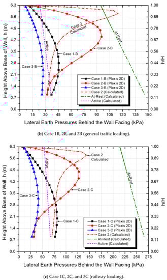 Lateral earth pressures behind the wall facing at: (a) Case 1A, 2A, and 3A (end of construction); (b) Case 1B, 2B, and 3B (general traffic loading); and (c) Case 1C, 2C, and 3C (railway loading).